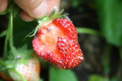 Our strawberries have been ripening daily. Each day we get a little bowlful to enjoy for breakfast and midday snacks. The girls love to wonder out their when they need a little pick me up to search for a sweet red berry. Unfortunately, every visit to the healthy patch has been accompanied with bad news that more berries were half eaten.