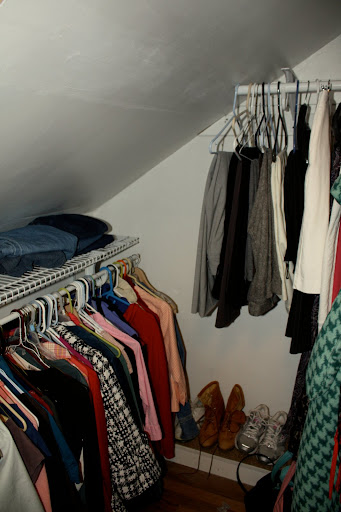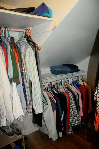 One of the projects I have appreciated the most is closet revamp. Before there was a rod where I hung my shirts that extended from the board that you can see has been cut off- the one that supports the shelf to the left of the picture. As a result I had to sort of shimmy in to see the clothes in the back and the entire space where my shirts now hang was empty- basically useless because I had to climb under my clothes to get there- not to mention there was a large beam sticking out that I often hit my head on. Now the closet is officially a walk-in, we can change in there, and I can see all my clothes with out suffering a large bruise on my head!