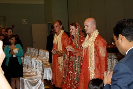 The bride, our friend Marinda, entering with her two brothers. Red is the traditional wedding color representing life and vivacity. Interestingly, neither the bride nor groom were Hindi. Both are LDS. They had their temple ceremony the weekend before, however the grooms family didn’t see them as married until after this Hindi service had been performed so they lived apart until after this.